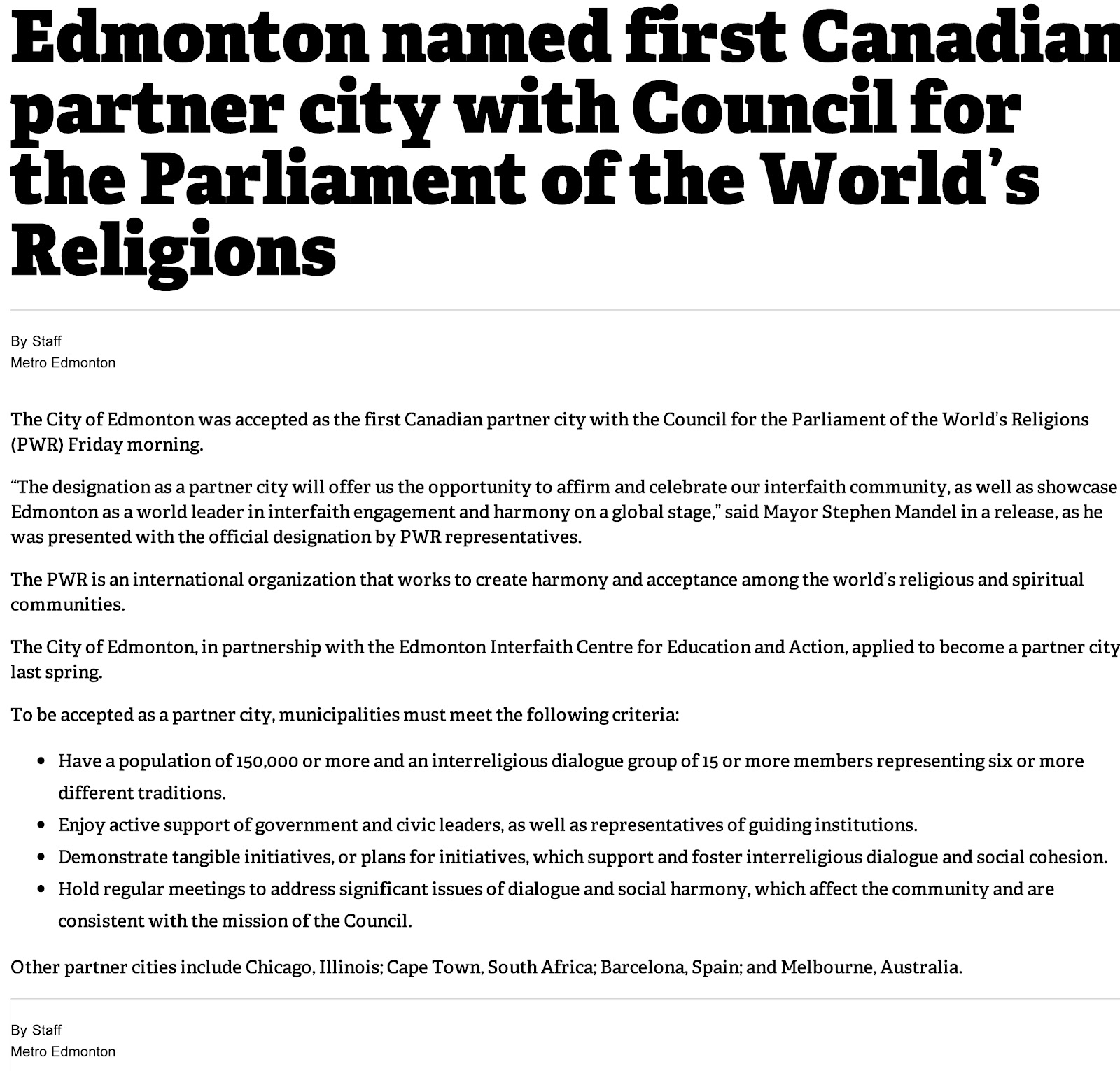 Edmonton to be 1st Canadian partner city with Council for the Parliament of the World's Religions